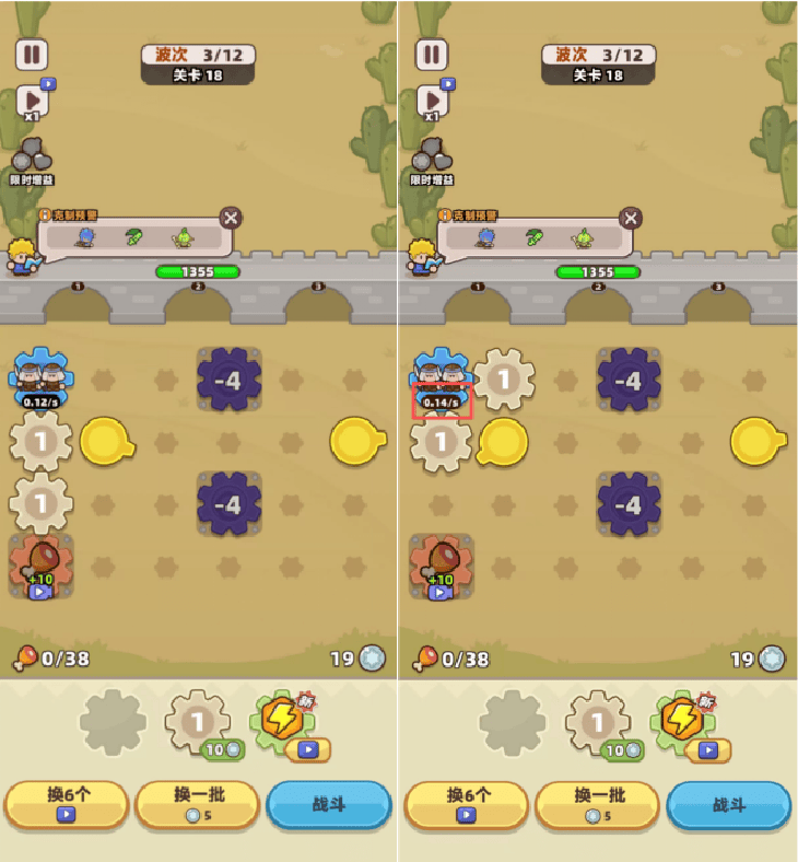 《Gear Defenders》除了每章节+1关的机制设定外,单关卡还存在中段必然较难的特质。这种特质会略为近似于《向僵尸开炮》《永远的蔚蓝星球》等类型,但该部分更适合用模拟经营游戏品类进行思考:中段的游戏偏难引导玩家进行一定的部队质量提升,但此时还未形成有效的引导闭环,并这里牵引出第一个额外机制:抑制机制。在《Gear Defenders》内,玩家放置的部队齿轮数量越多,出兵速度会受到抑制,而对部队齿轮合成升级则会将出兵速度进行一定的回复。另外,齿轮所在的不同方位,提供的速度也不尽相同,甚至合成前后也一样。抑制机制的存在,除了让游戏涵盖模拟经营的管理决策元素外,对中轻度用户传递出游戏智力驱动属性。