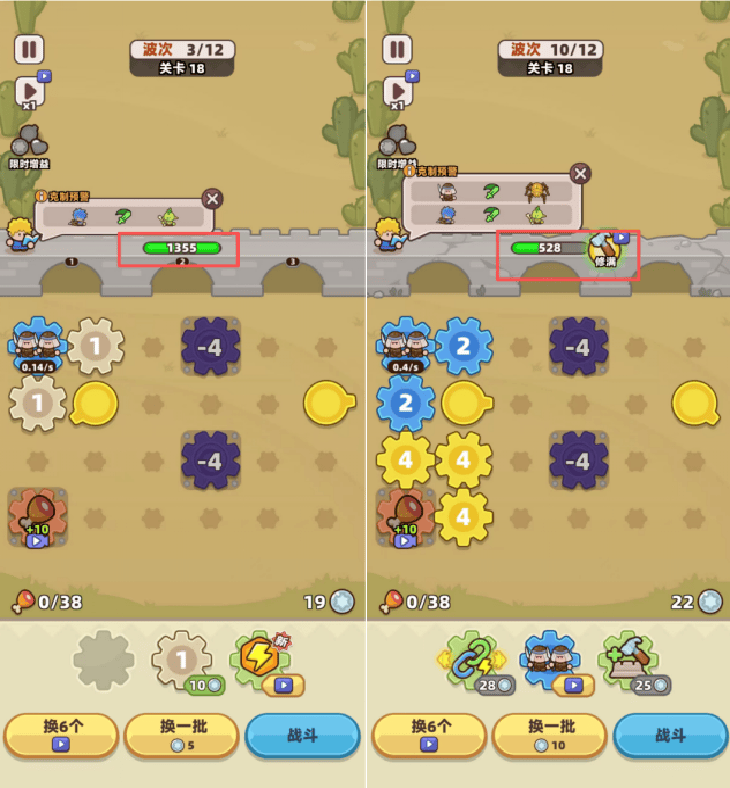 首先是《Gear Defenders》的初期印象,《Gear Defenders》采用海外休闲游戏常见的“即开即玩”形式:游戏已直接放置了兵种齿轮,玩家只需要放置倍速齿轮即可战斗。而相比于《Gear Fight》则拆分为放置士兵、放入加速齿轮、调整加速齿轮位置三步。表现上,《Gear Fight》无论是步骤衔接还是整体用时规模都接近为《Gear Defenders》的2倍。并且,由于《Gear Fight》对战区域设计在下半区,基于人类视觉习惯来说并没有《Gear Defenders》的视觉适应度高。