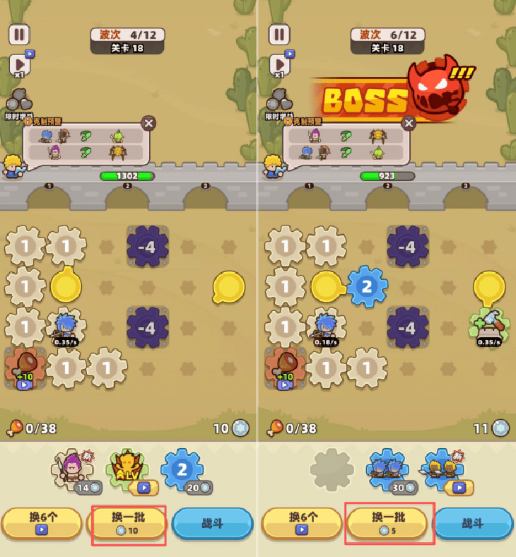 而后续的步骤上,《Gear Fight》除了前面提到的细化之外,游戏会偏向引导用户进行商店刷新。在进入正式关卡过程,《Gear Fight》体现出与《Gear Defenders》的产品设计差异: