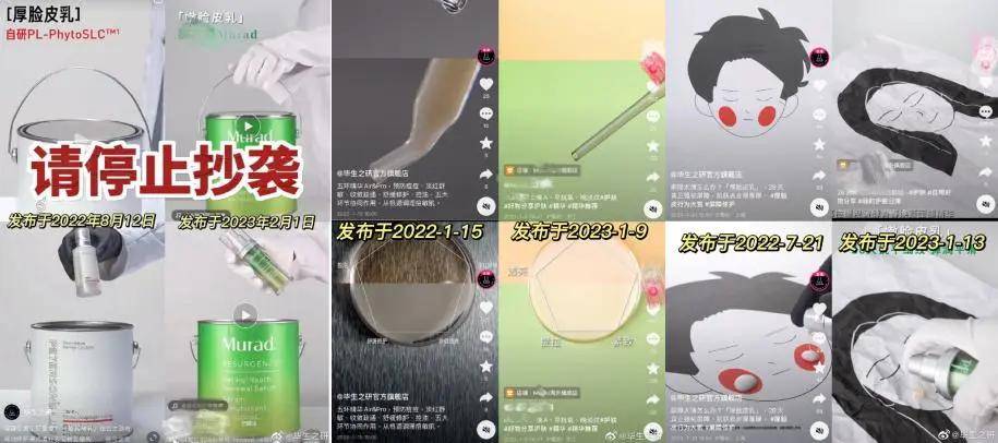 在视频设计方面也有类似案例,2023年联合利华旗下功效护肤品牌Murad某款产品宣传视频被指1:1复刻毕生之研2021年“厚脸皮乳”创意视频,分镜、构图乃至皮肤结构动画演示高度相似。
