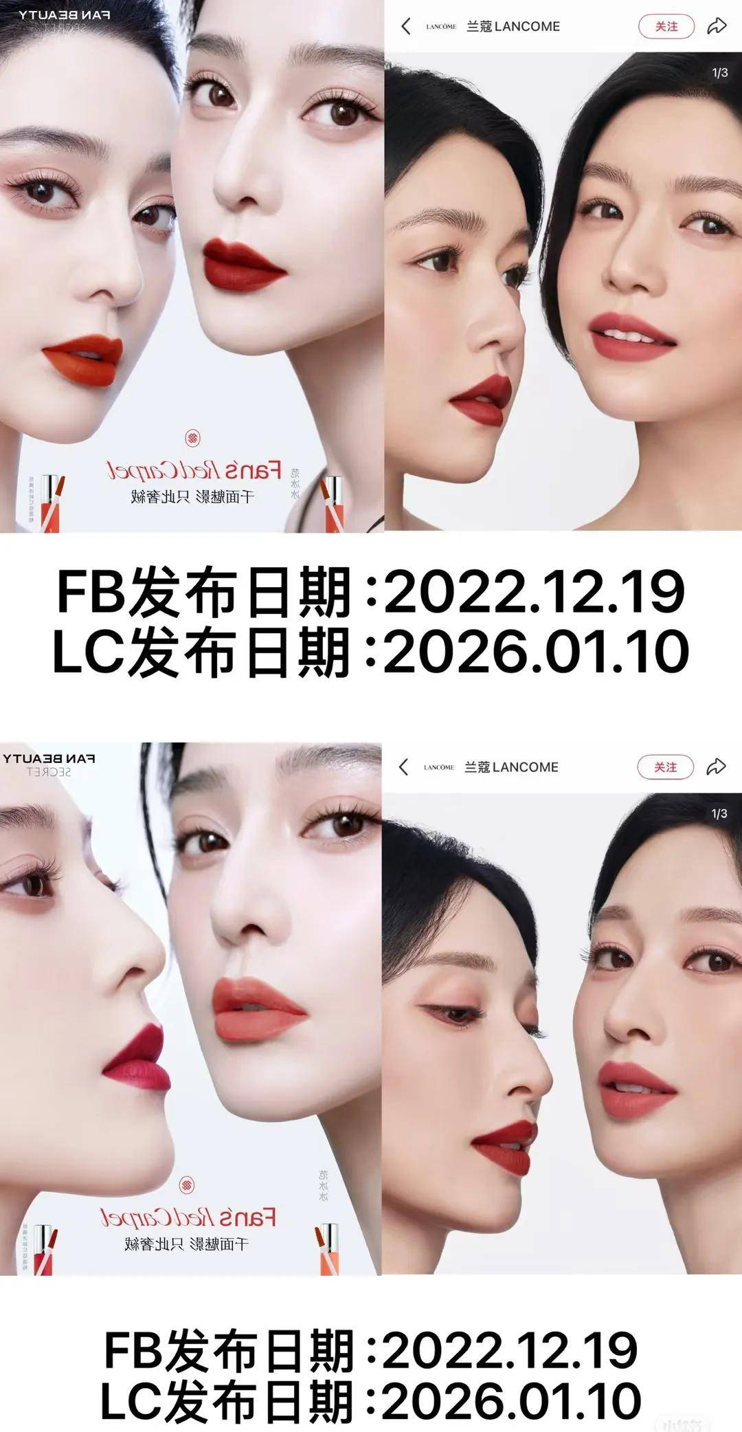 第二层是产品核心语义的雷同。Fan Beauty品牌自2022年起,便围绕“红毯唇膏”主题进行系列传播。其创始人范冰冰“红毯女王”的个人形象与“红毯绝色”这一标签深度绑定,使之成为品牌资产的一部分。而兰蔻此次新品的主打传播语“解锁你的红毯绝色”,在已有前序市场认知的情况下,无疑强化了网友及粉丝的关联联想。
