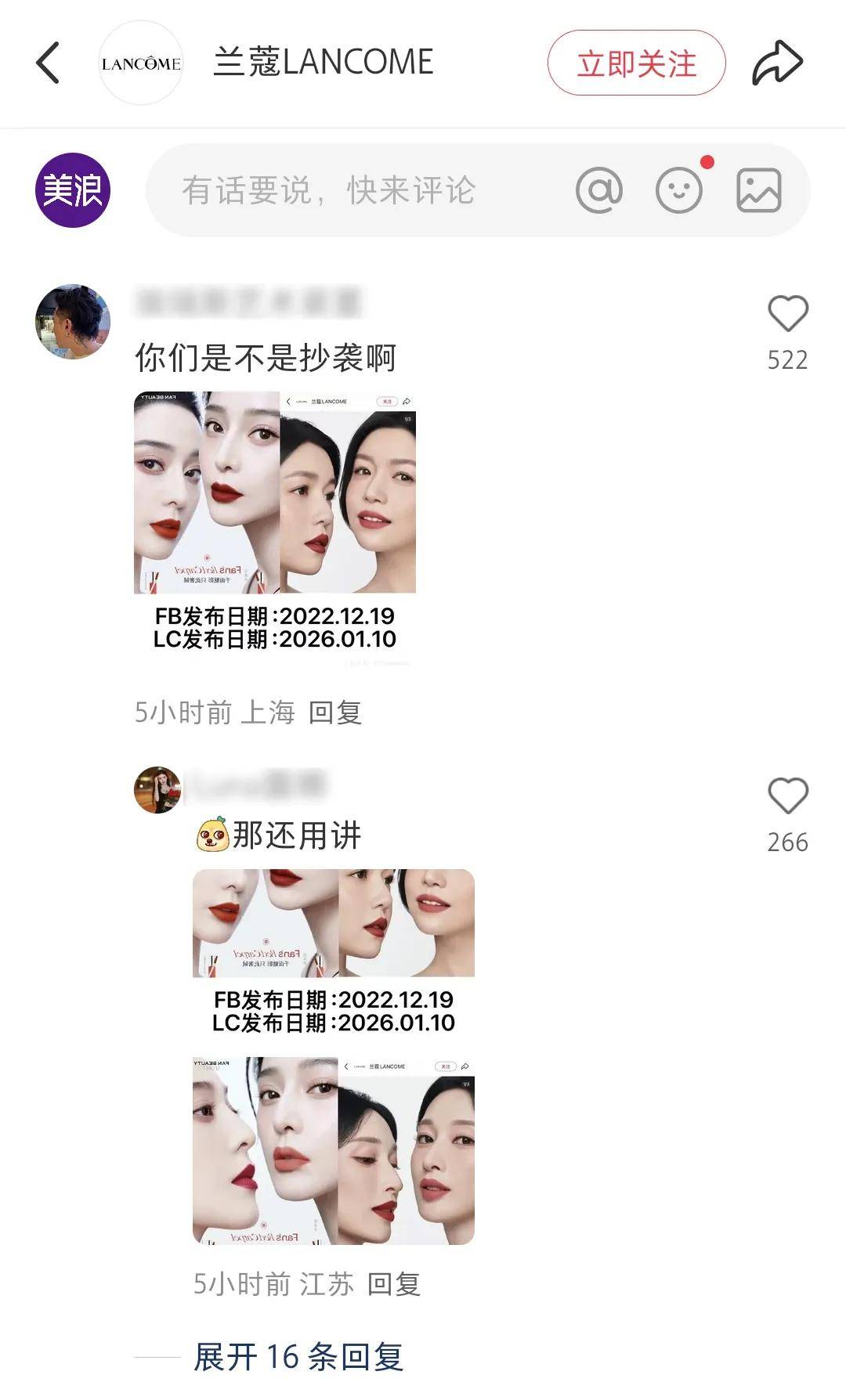 即便兰蔻并无主观抄袭,其品牌行为在当下高度敏感的舆论环境中,仍容易被解读为“对标”“借鉴”甚至“挪用”,从而引发超出原始层面的讨论。截至发稿,兰蔻及Fan Beauty品牌方均未对事件有任何回应。