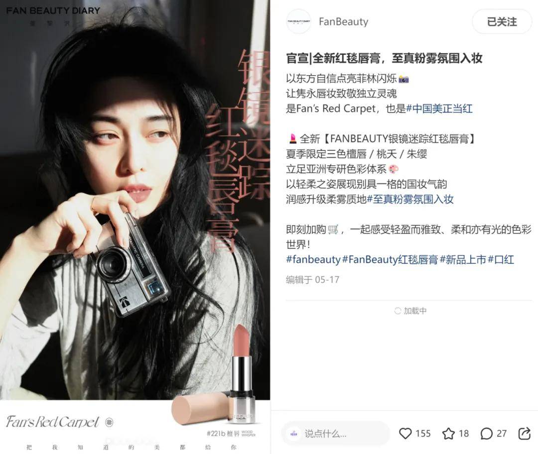 而回看此次口红产品所引发的文案争议,“红毯绝色”这一表述,因与范冰冰长期以来的“红毯女王”形象高度绑定,已被品牌方持续用于相关产品传播,其海报与文案在小红书、微博等平台获得较高曝光,逐步沉淀为Fan Beauty红唇产品的重要识别符号之一。